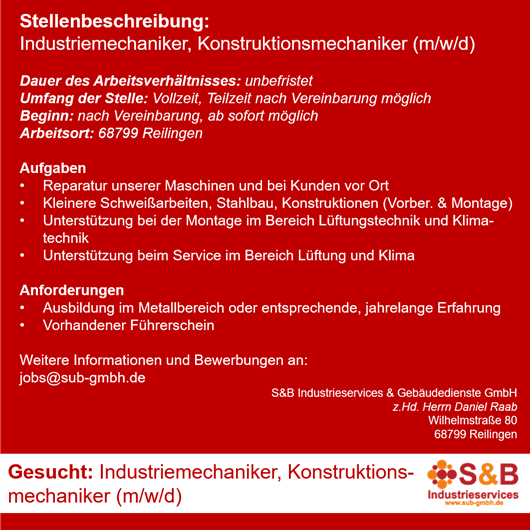 RNJ-2023-0007: Industriemechaniker, Konstruktionsmechaniker (m/w/d)